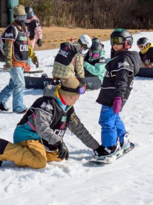 着替えからお手伝いさせていただく中で、子どもたちの元気な雰囲気に引っ張られる形で自然と打ち解けることができ、スノーボードを始められました。